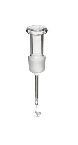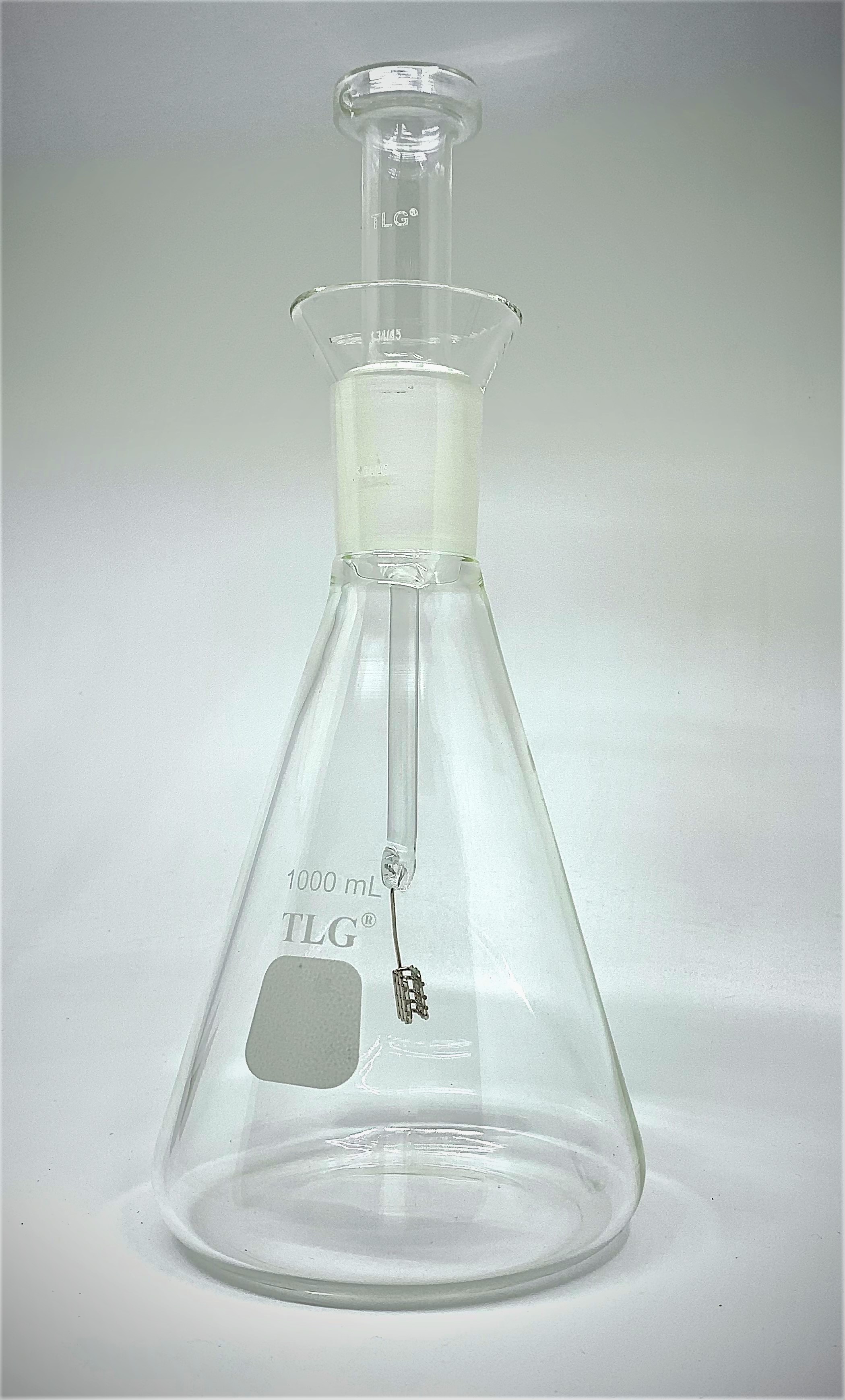This is an oxygen combustion flask of borosilicate glass, with a Standard Taper 34/45 ball joint stopper. Use with a detachable platinum sample carrier suspended from the stopper hook. The pinch clamp holds the stopper in place during combustion.